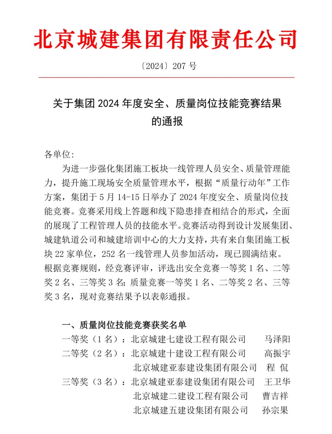 为进一步强化集团施工板块一线管理人员安全质量意识,提升施工现场安全质量管理水平,5月14日至15日,城建集团在新机场线北延01标项目部举办安全、质量岗位技能竞赛,来自城建集团施工板块22家单位的252名一线管理人员同台竞技、激烈角逐。集团公司选派10名职工参加此次竞赛(安全、质量人员各5名)。
